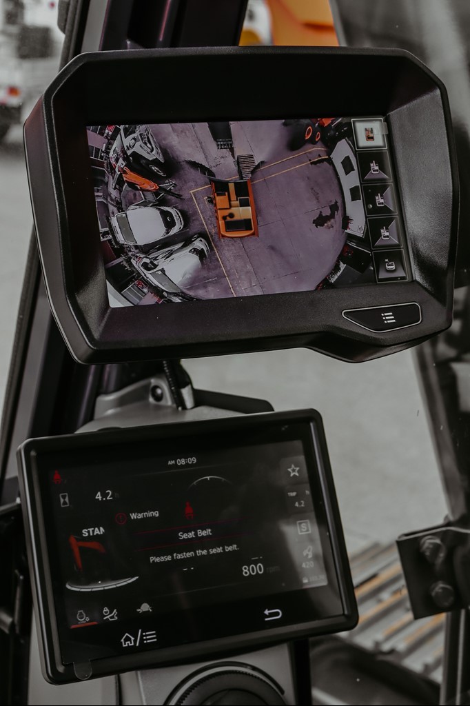 Operator comfort has also been significantly improved. The spacious cab features reduced noise levels, an adjustable air-suspension seat with optional heating, upgraded climate control, refined pedal layout, and multiple storage solutions. A clear LCD monitor provides access to machine settings, operational data, and feeds from optional rear and side cameras. When equipped with the optional around view monitor, the excavator offers a full 360-degree view, enhancing situational awareness and supporting safer operation in high traffic or restricted work areas.